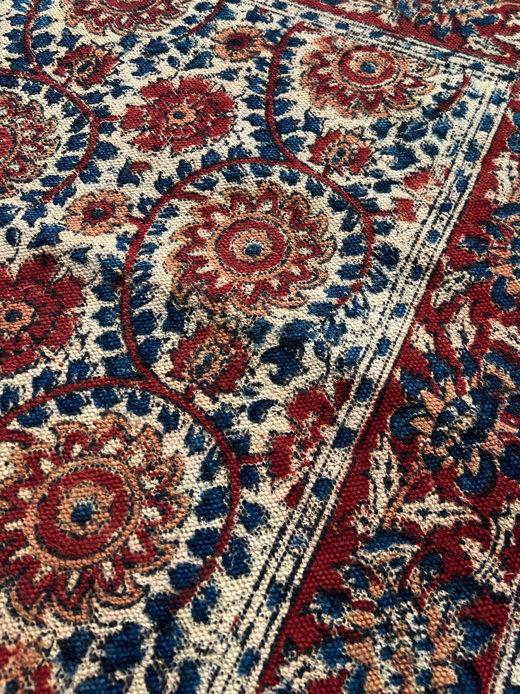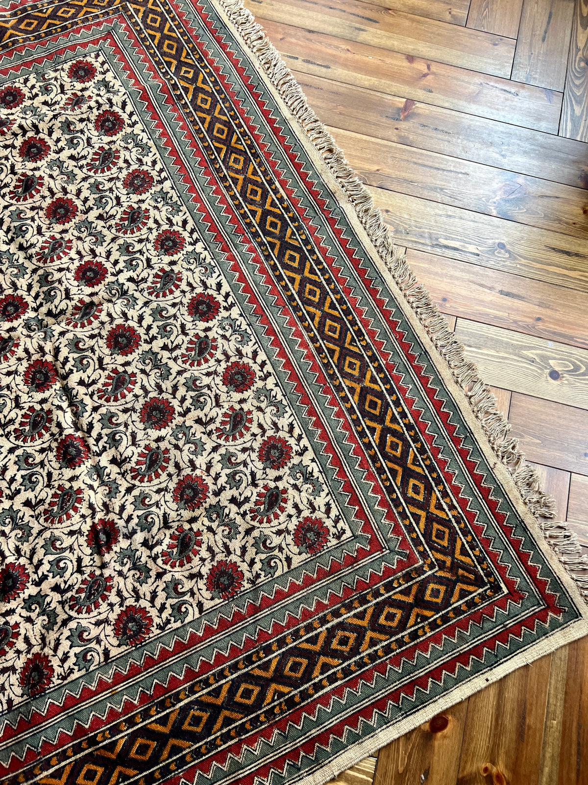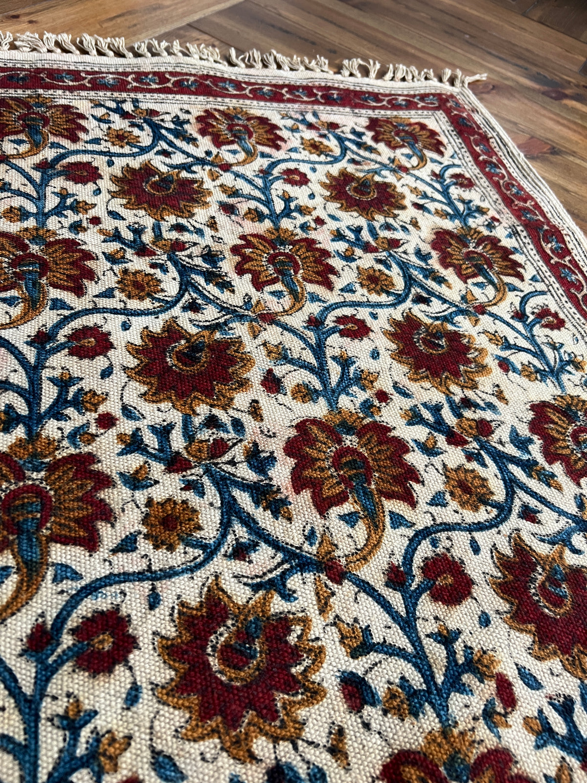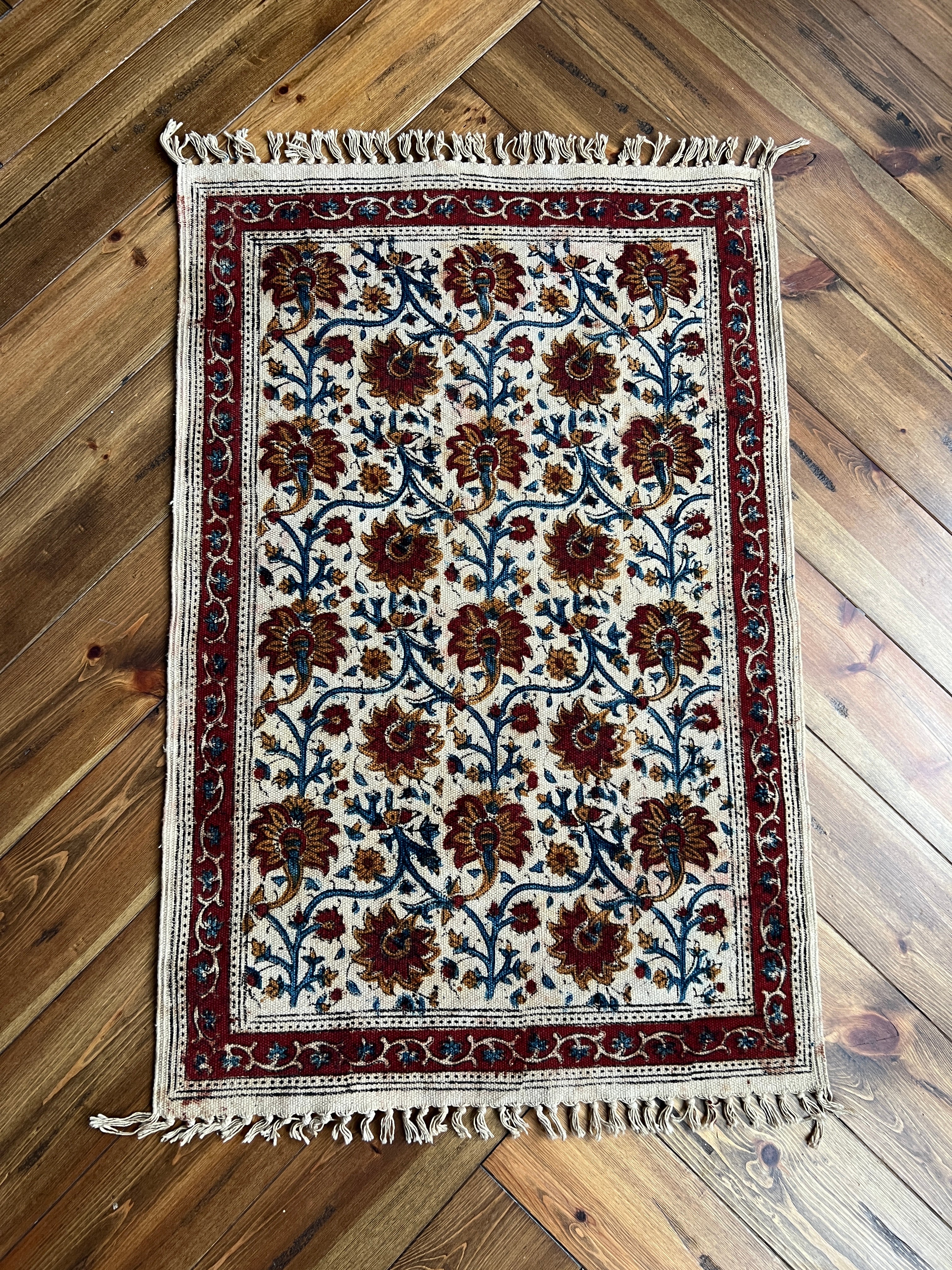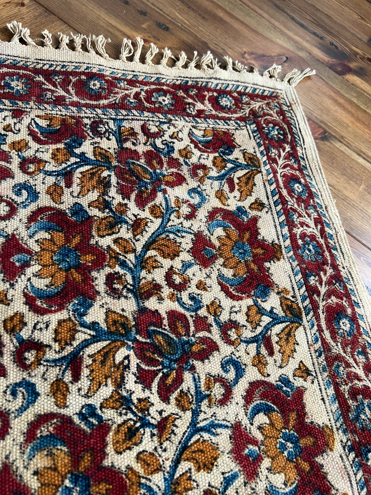 Studio Kahaani brings you a curated collection of rugs, sourced directly from artisans in southern India. These sustainable pieces are hand-woven from pure cotton, then block printed using traditional Kalamkari techniques and non-toxic vegetable dyes.