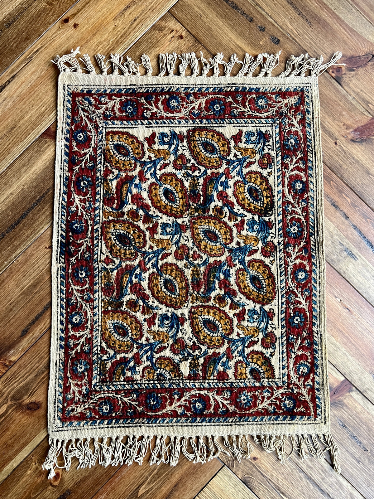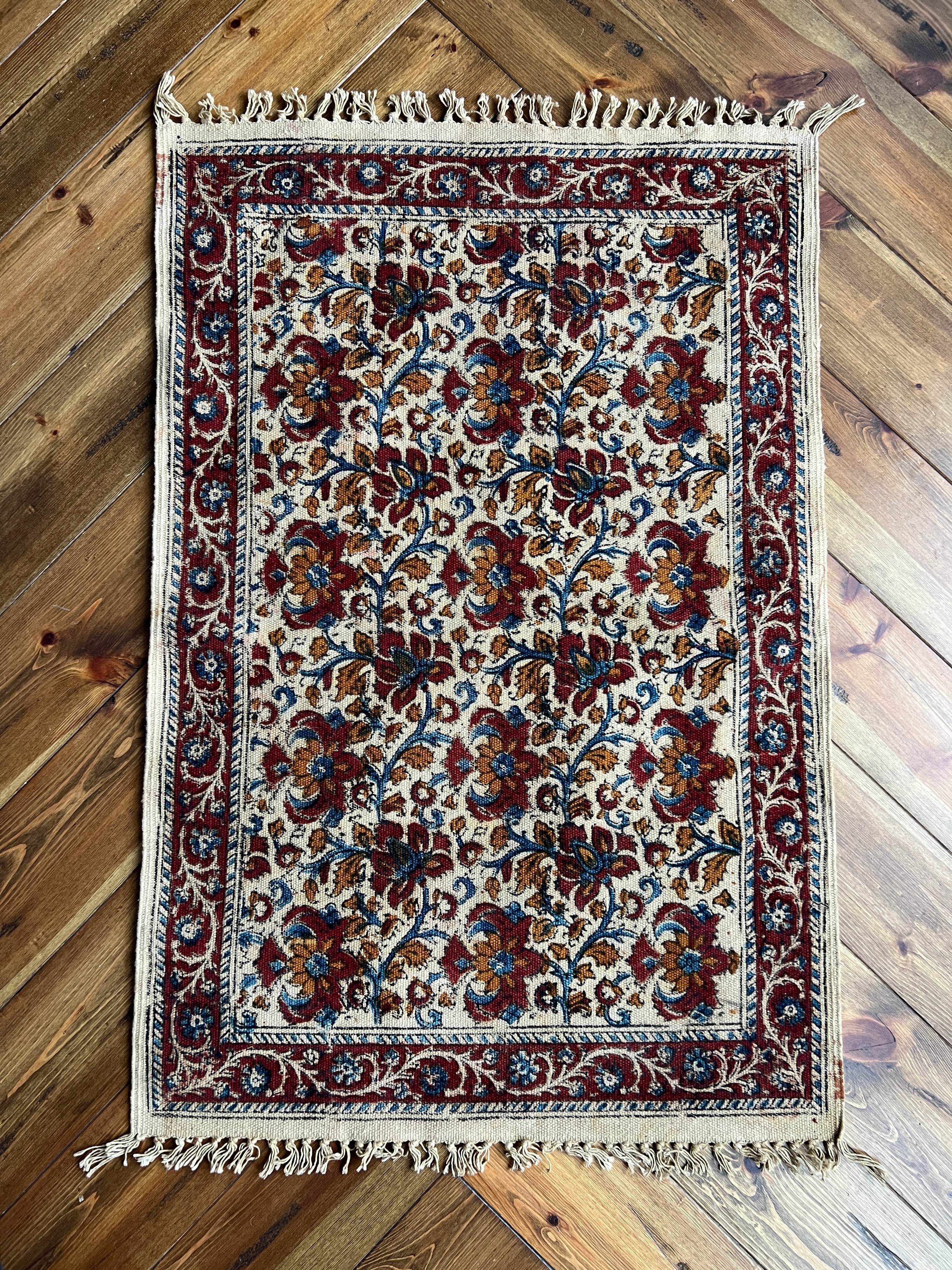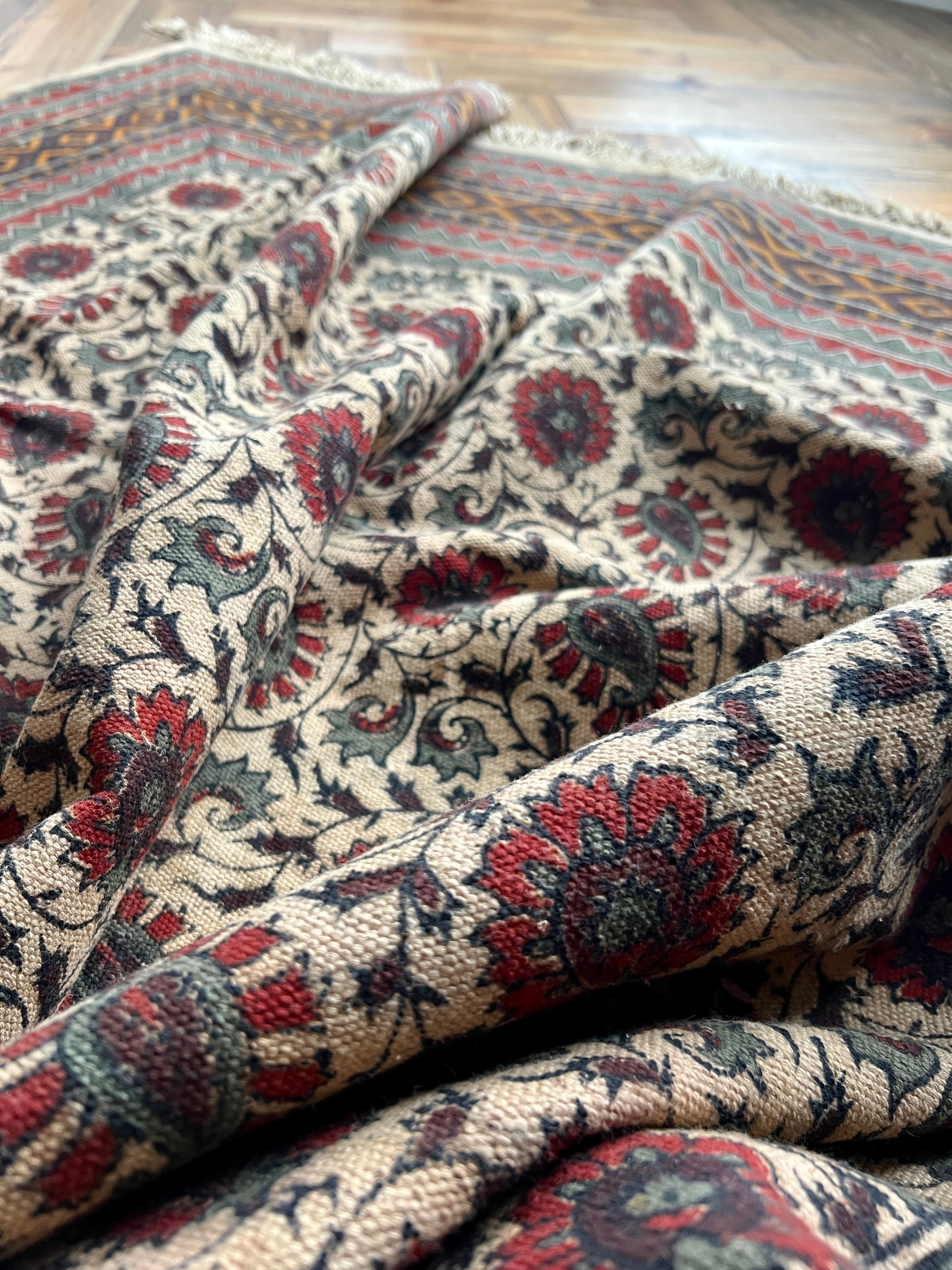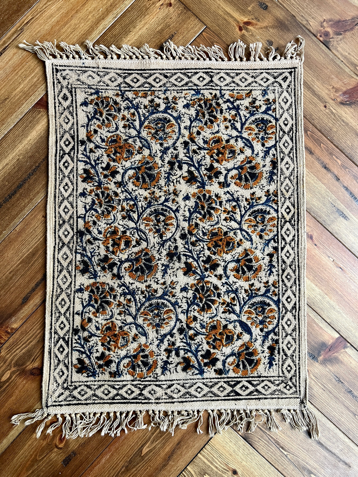 Studio Kahaani brings you a curated collection of rugs, sourced directly from artisans in southern India. These sustainable pieces are hand-woven from pure cotton, then block printed using traditional Kalamkari techniques and non-toxic vegetable dyes.