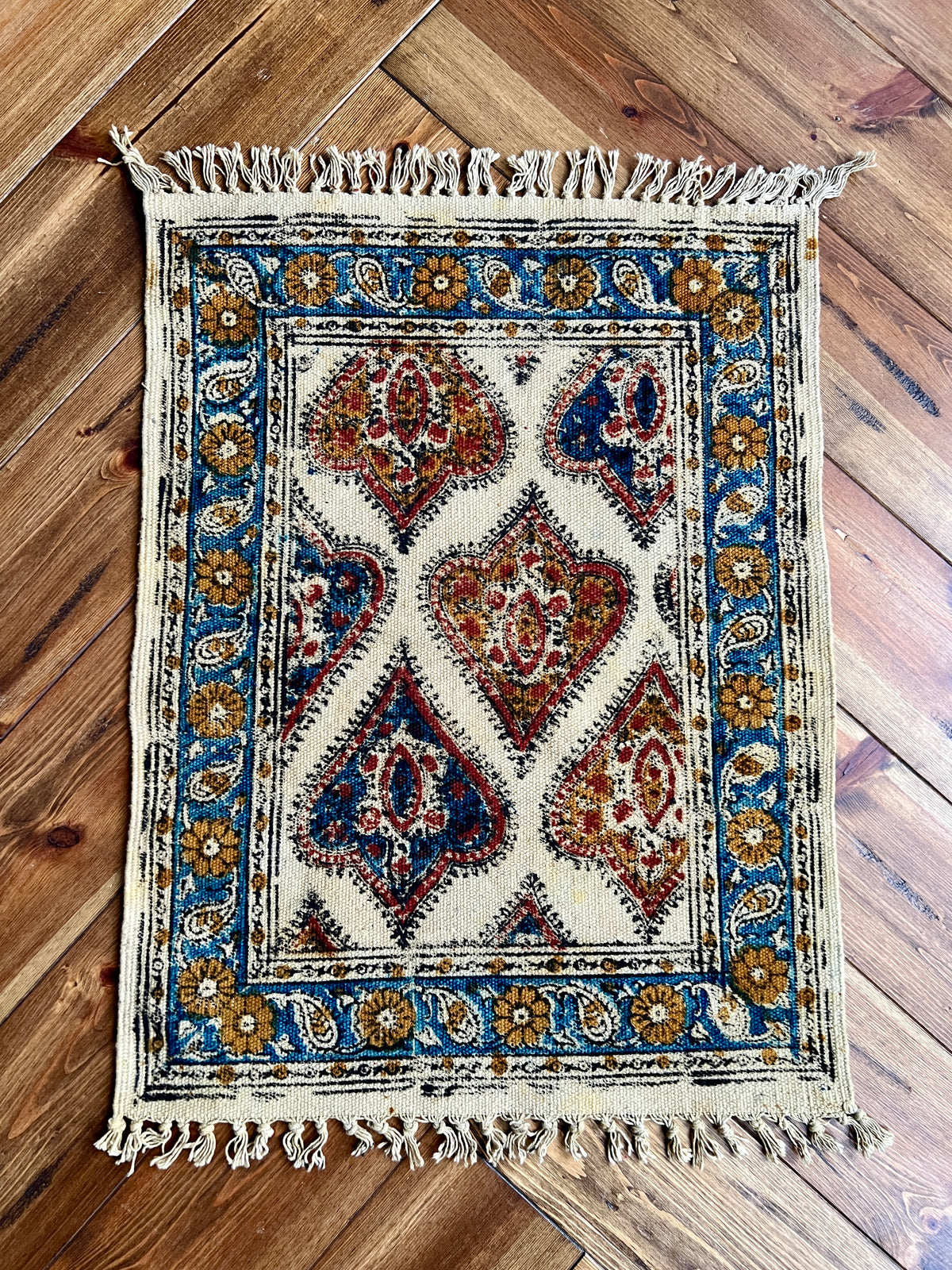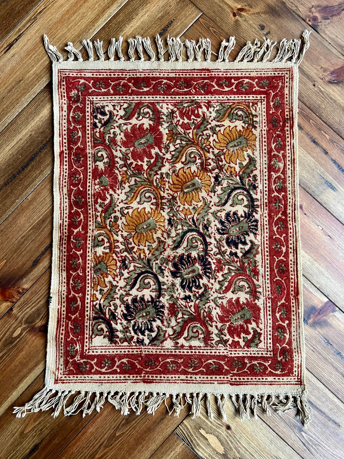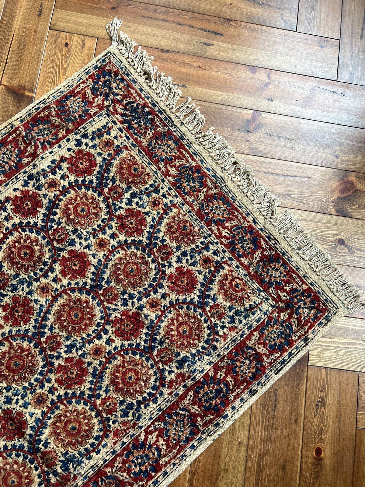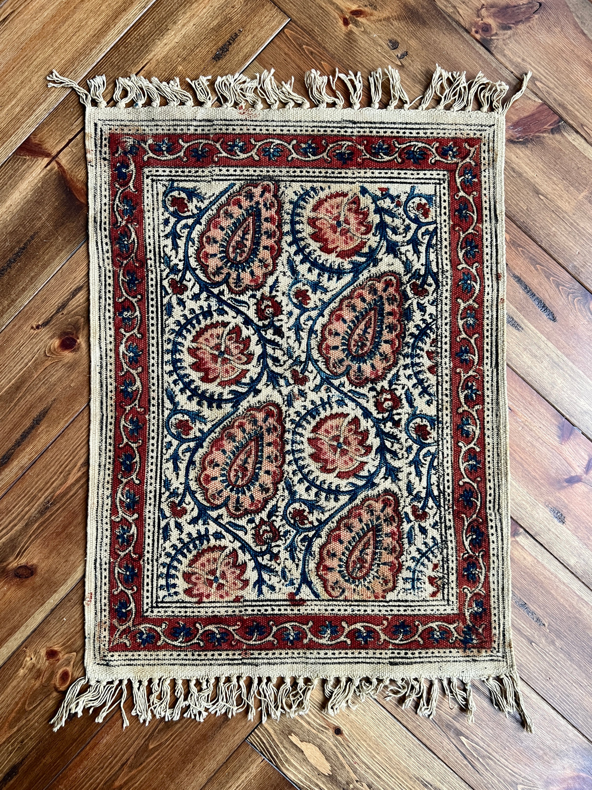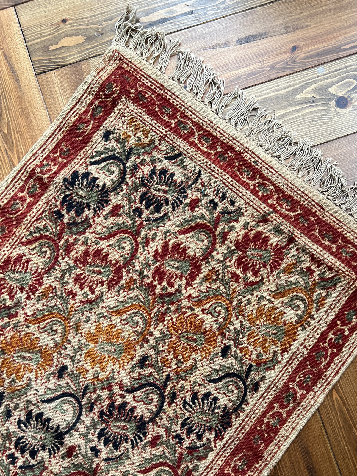 Studio Kahaani brings you a curated collection of rugs, sourced directly from artisans in southern India. These sustainable pieces are hand-woven from pure cotton, then block printed using traditional Kalamkari techniques and non-toxic vegetable dyes.